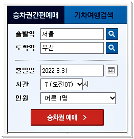 컴퓨터에서는 레츠코레일 홈페이지를 이용하여 예매할 수 있는데요. 상단 왼쪽 메뉴를 보시면 승차권 간편 예매 메뉴를 이용하여 진행할 수 있습니다. 앱과 했던 것처럼 마찬가지로 출발역, 도착역, 출발일, 시간, 인원을 선택하고 승차권 예매를 진행해 주시면 됩니다.